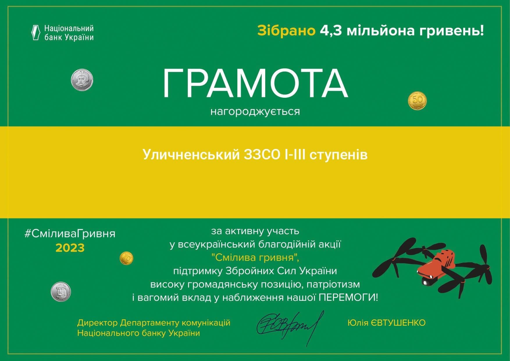 Уличненський ЗЗСО І-ІІІ ступенів долучився до Всеукраїнської благодійної акції «Смілива гривня» та нагороджений грамотою за підтримку Збройних Сил України, високу громадянську позицію, патріотизм і вагомий вклад у наближення нашої ПЕРЕМОГИ !